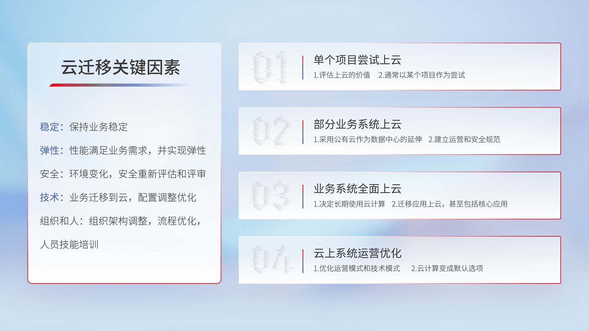 结合实际业务,,,从规划设计、、云平台选型、、、、云原生改造、、数据迁移、、集成交付,,迁移全过程为客户识别最佳上云路径,,做好风险识别管理,,,设计网络架构、、、、身份权限、、、安全审计合规、、、、操作审计、、日志审计、、监控告警策略、、多站点容灾设计等,,对云上基础设施进行整体规划,,,提升IT治理水平,,,以满足弹性、、高可用、、、、高性能的需求。。。。
