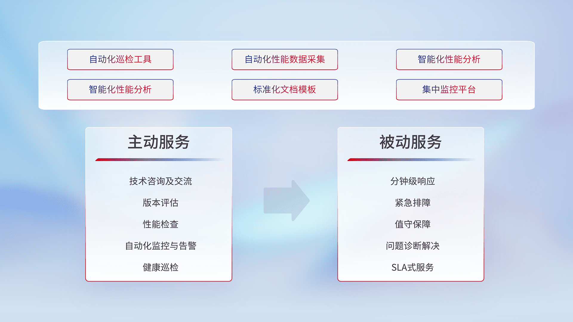 智能化工具和标准化文档,,,保障服务质量,,提供主动服务(包含技术咨询、、版本评估、、、、性能检查、、、自动化监控与告警、、、健康巡检)和被动服务包含(分钟级响应、、紧急排障、、、、值守保障、、、、问题诊断解决、、SLA服务)。。。。